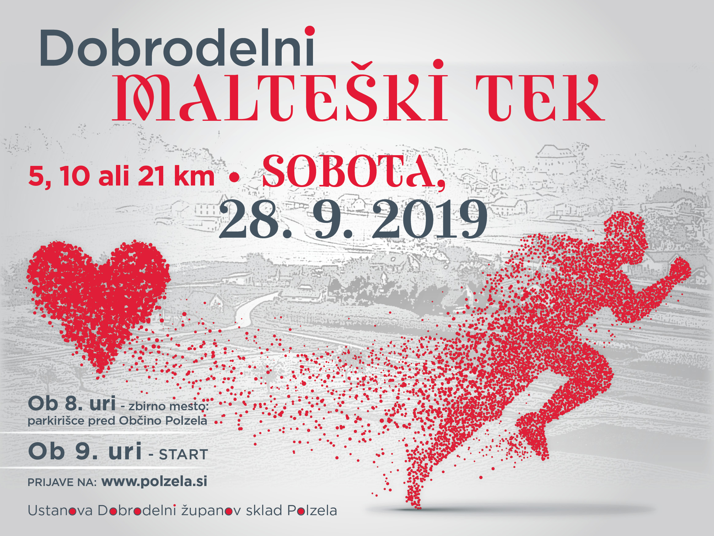 Ustanova dobrodelni županov sklad Polzela organizira letos že 7. DOBRODELNI MALTEŠKI TEK, ki bo v soboto, 28. 9. 2019, od 9. do 12. ure. Tekaške proge na 5, 10 in 21 km potekajo po poteh občine Polzela in so lahke, z nekaj vzponi, ter primerne za vse starostne skupine. Namenjen je vsem ljubiteljem aktivnega in zdravega načina življenja. Primeren je za družine, rekreativne tekače, profesionalne tekače, starejše, mlajše, zagotovo pa za vse tiste, ki uživajo v naravi.