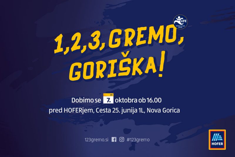 Dobro počutje je rezultat teka na dolge proge, vztrajnosti in prepričanja, da nas majhni koraki lahko pripeljejo do velikih ciljev. Zato so pri HOFERju združili moči z motivatorjem in voditeljem Markom Potrčem ter športnim strokovnjakom Janom Kovačičem. Z vseslovensko družbeno odgovorno akcijo 1, 2, 3, GREMO! sta ambasadorja Slovenijo povezala v gibanju. Led sta prebila v Beli krajini, nadaljevala na Obali, Gorenjskem, Koroškem, v Ljubljani in Prekmurju, sedaj je na vrsti Goriška.