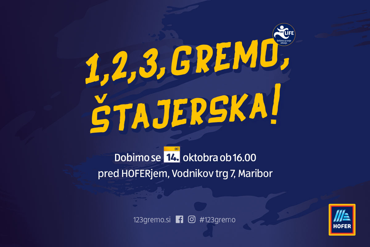 Tega se zavedajo tudi pri HOFERju, zato z vseslovensko družbeno odgovorno akcijo 1, 2, 3, GREMO! Slovenke in Slovence spodbujajo k skrbi za zdravje in dobro počutje. Program vadbe, ki sta ga zasnovala ambasadorja projekta, motivator in voditelj Marko Potrč ter športni strokovnjak Jan Kovačič, bo predstavljen v skupno osmih slovenskih krajih – led smo prebili v Beli krajini, nadaljevali na Obali, Gorenjskem, Koroškem, v Ljubljani, Prekmurju ter na Goriškem, sedaj za piko na i prihajamo še na Štajersko.